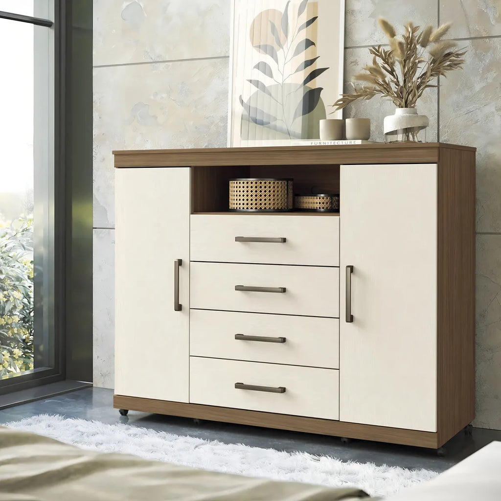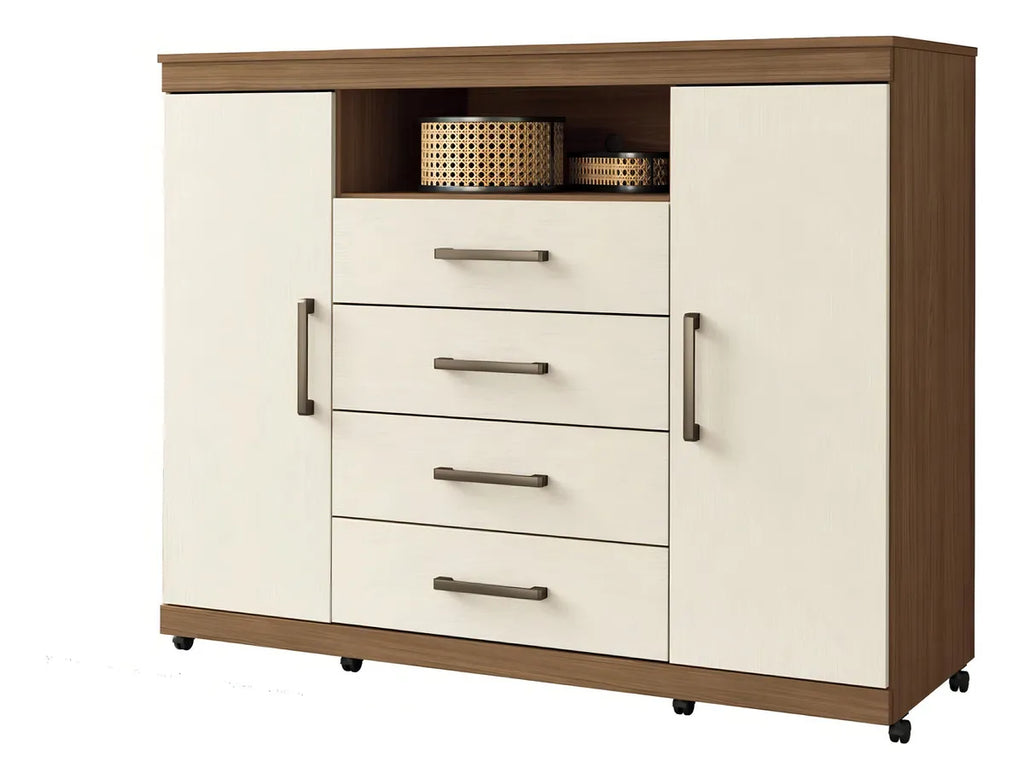 Cômoda para Quarto 2 Portas 4 Gavetas 1 Nicho Master com Rodízios Jatobá/Areia