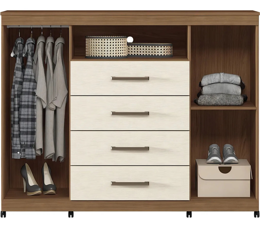 Possui duas portas: uma porta com cabideiro em alumínio, para pendurar calças, camisas, camisetas...e a outra porta com prateleiras para guardar sapatos, caixas, decoração e demais objetos!
