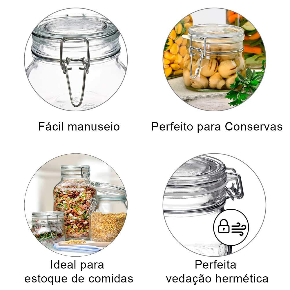 Detalhes Pote de vidro hermetico 1,5 Litro (1500ml) Fido Rocco Bormioli importado da ItaliaTenha o melhor pote hermetico do mercado. Fabricado e importado da Italia, o pote para armazenamento de alimentos com fechamento hermetico da marca Bormioli, ira garantir alimentos frescos, saudaveis e conservados por muito mais tempo!Vidro de alta qualidade, dura resistencia e nao mancham!Os potes de armazenamento Fido possuem fechos hermeticos de vedacao, onde sera vedado o ar e a umidade. Do congelador a bancada, use-os para alimentos secos, frescos ou que sobram. Eles tambem sao otimos como recipientes para iguarias caseiras!Pode ser usado para armazenamento de graos, arroz, feijao, biscoito, bolachas, cereais e varios outros alimentos no qual quer manter fresco e sem umidadeNao levar o fecho de aluminio e borracha de vedacao ao microondas e maquina de lavar louca Especificacoes Tecnicas Capacidade1,5 Litro (1500ml)Altura22,5cmLargura10cm