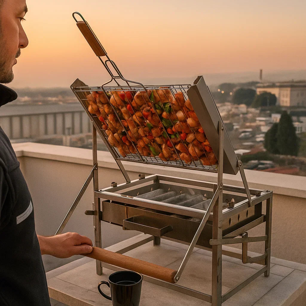 A Churrasqueira com Grelha Giratória 360° é uma obra de engenharia parrillera. Gira sozinha, distribui o calor igual um mestre do fogo e mantém cada pedaço suculento como se tivesse saído da churrasqueira do Dom BBQ.